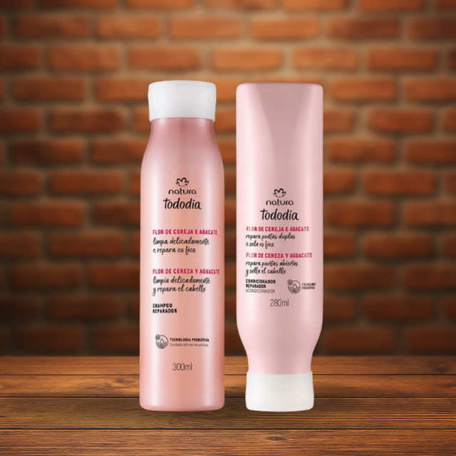 Este kit traz o Shampoo Reparador Flor de Cereja e Abacate, que limpa e recupera os cabelos danificados, e o Condicionador Reparador Flor de Cereja e Abacate, que sela os fios, reduz pontas duplas e promove reparação da fibra capilar.